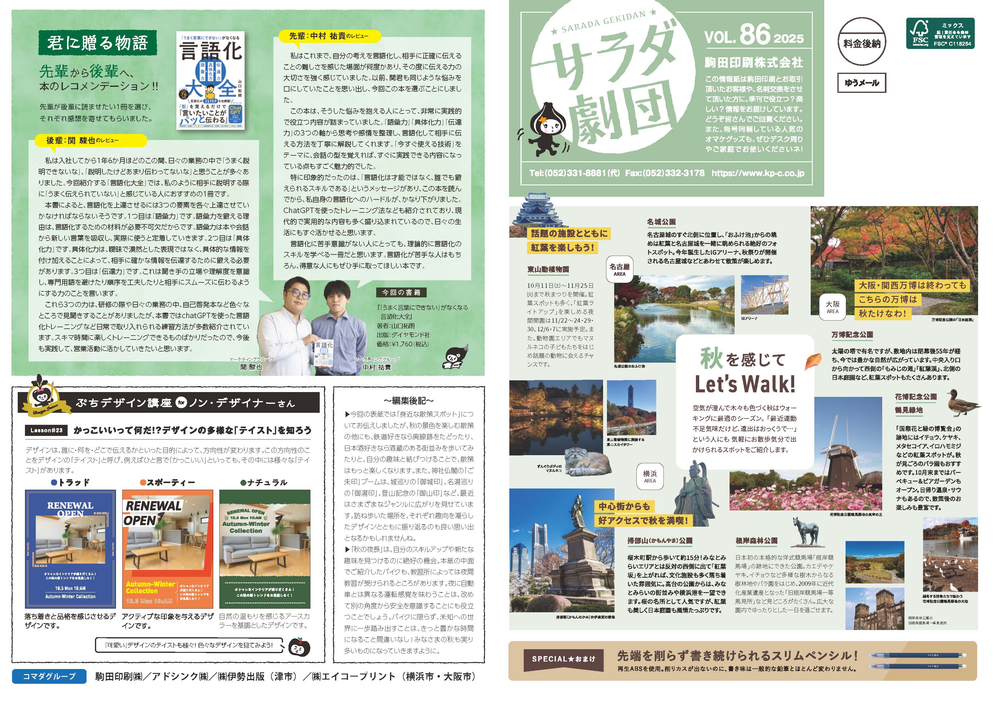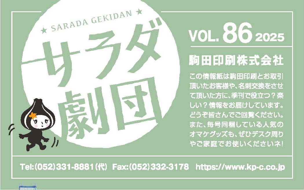 サラダ劇団 Vol.86 2025.10.1発行2025.10.01 Tweet Share RSS ★プレゼント 『サラダ劇団 スリムペンシル』先端を削らず書き続けられるスリムペンシル!再生ABSを使用。削りカスが出ないのに、書き味は一般的な鉛筆とほとんど変わりません。【巻頭】「秋を感じて Let’s walk!」 【特集】通(ツウ)が教える、Wonderful World#6 乗らなきゃ人生損する? バイクの世界 【きらりと光る企業さん】株式会社国際地学協会様【本紙】 駒田だより, サラダ劇団DM, 情報誌, ニュースレター関連記事一覧 会社見学2017.04.11 2月全体朝礼を開催2020.02.05 新入社員研修発表会2017.04.24 12月全体朝礼を開催2019.12.06 7月全体朝礼を開催2019.07.04 2020年度採用 3次試験を行いました2019.05.14 プライバシーマーク 更新のお知らせ2024.04.08 2月全体朝礼を開催2021.02.05