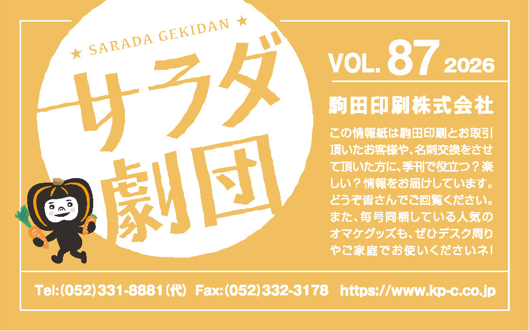 salad_87_title2025.12.16 Tweet Share RSS 関連記事一覧 夏季休業のお知らせ2022.08.10 NDSネットワーク様 ロゴマークデザイン2026.01.05 済生会横浜市東部病院様 記念誌2024.01.11 2022年夏季休業のご案内2022.07.20 年末年始の休業日のご案内2022.12.15 駒田印刷オリジナル ノートカレンダー2022 のご注文受...2021.05.21 事例紹介)NDS 様2018.09.04 サラダ劇団 Vol.82 2024.10.15発行2024.10.15